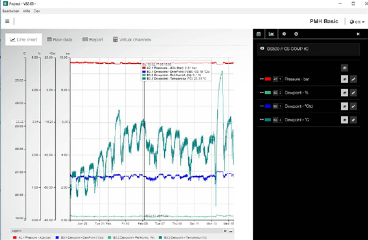 PMH Basic, ölçülen verilerin USB bellek veya Ethernet aracılığıyla okunmasını sağlayarak grafik ve tablo biçiminde veri değerlendirmesi sunar. Sezgisel kullanım sayesinde tüm önemli işlevler gösterge paneli üzerinden erişilebilir. Daha iyi bir görselleştirme için ölçüm eğrileri renklerle belirtilir. Kullanıcı, minimum ve maksimum ölçüm değerlerinin hangi zamanda ve ne kadar süreyle gerçekleştiğini hızlı bir şekilde görebilir.