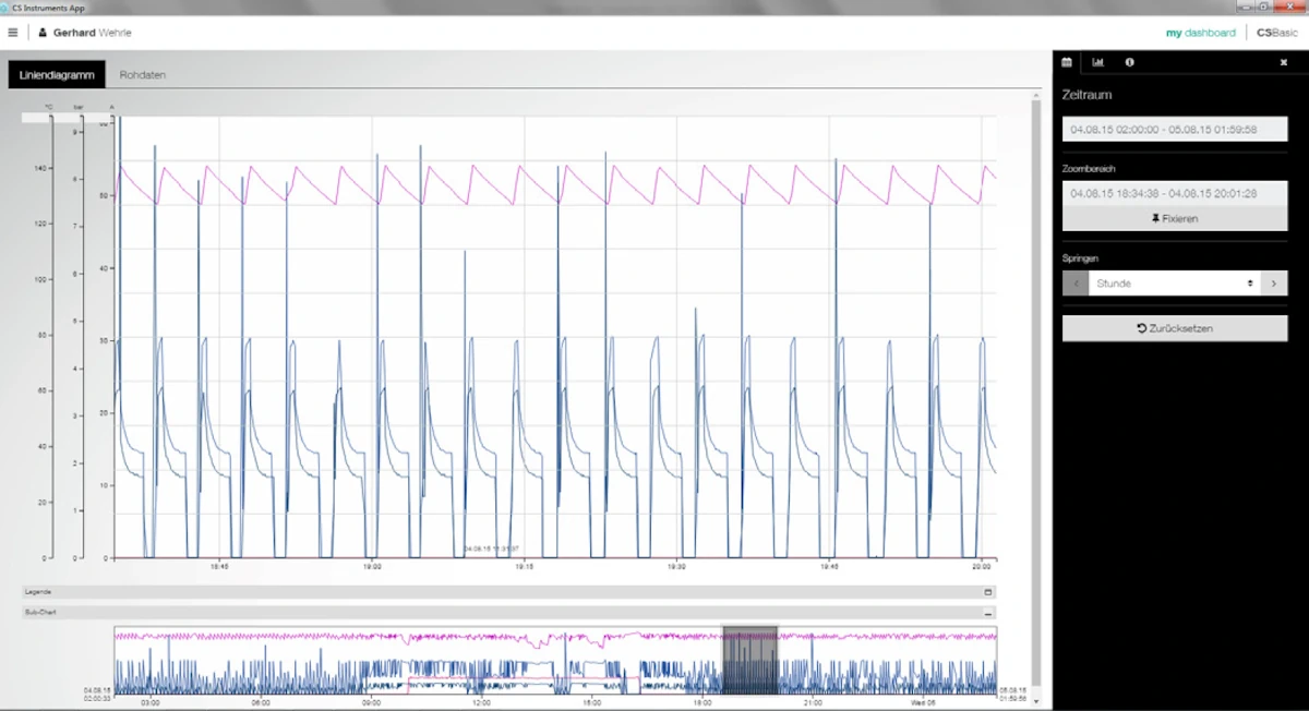 Tüm ölçüm eğrileri renkli olarak gösterilir. Önemli işlevler entegrasyon içerisindedir: serbest yakınlaştırma, tek bir ölçüm eğrisini seçme veya devre dışı bırakma, serbest dönem seçimi, eksen ölçekleme, renk seçimi vb. Bu görünüm PDF dosyası olarak kaydedilebilir ve e-posta ile gönderilebilir. Farklı veriler ortak bir dosyada birleştirilebilir.