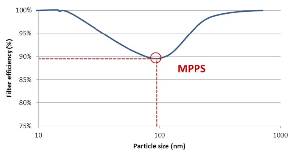 Aşağıdaki şekilde de açıkça görüldüğü gibi, yakalama mekanizmalarının parçacık boyutuna olan bağımlılığı, verimlilik eğrisinin minimum seviyeyi göstermesine neden olur. Uygulamalarımızda, bu minimum değer tipik olarak 0,1 – 0,2 µm boyut aralığında bulunur (şekildeki örnekte MPPS 0,15 µm’dir). Bu parçacıklar, birbirinden ayrılması en zor olanlardır ve bu nedenle, “en fazla nüfuz eden parçacık boyutu” yani MPPS olarak adlandırılır. MPPS’nin tam konumu, her bir filtreleme mekanizmasının önemi ve toplam filtreleme verimliliği; örneğin havanın hızı, ortamın iç yapısı, yağ boyutu dağılımı ve yağ konsantrasyonuna bağlıdır.